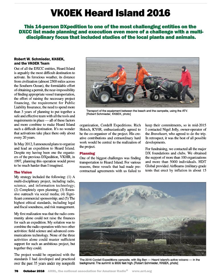 The winning article for the October 2016 QST Cover Plaque award is “VK0EK Heard Island 2016” by Robert W. Schmieder, KK6EK.