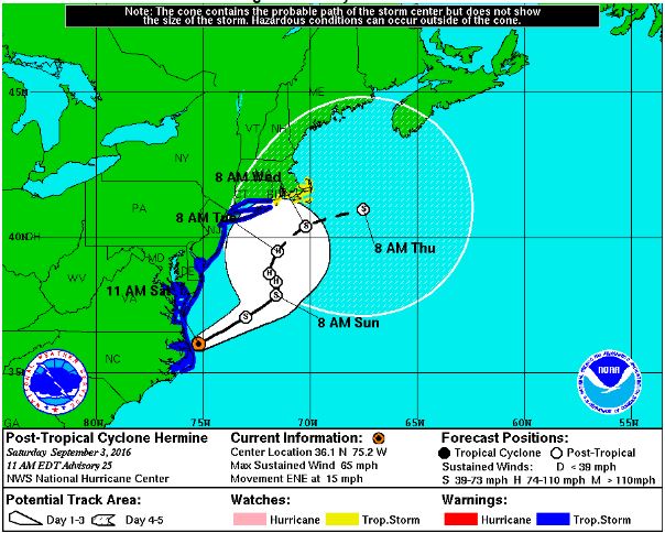 As of 1500 UTC on September 3, Hermine was about 35 miles east-southeast of Duck, North Carolina, and some 80 miles southeast of Norfolk, Virginia, with maximum sustained winds of 65 MPH. The storm is moving to the east-northeast at 15 MPH.