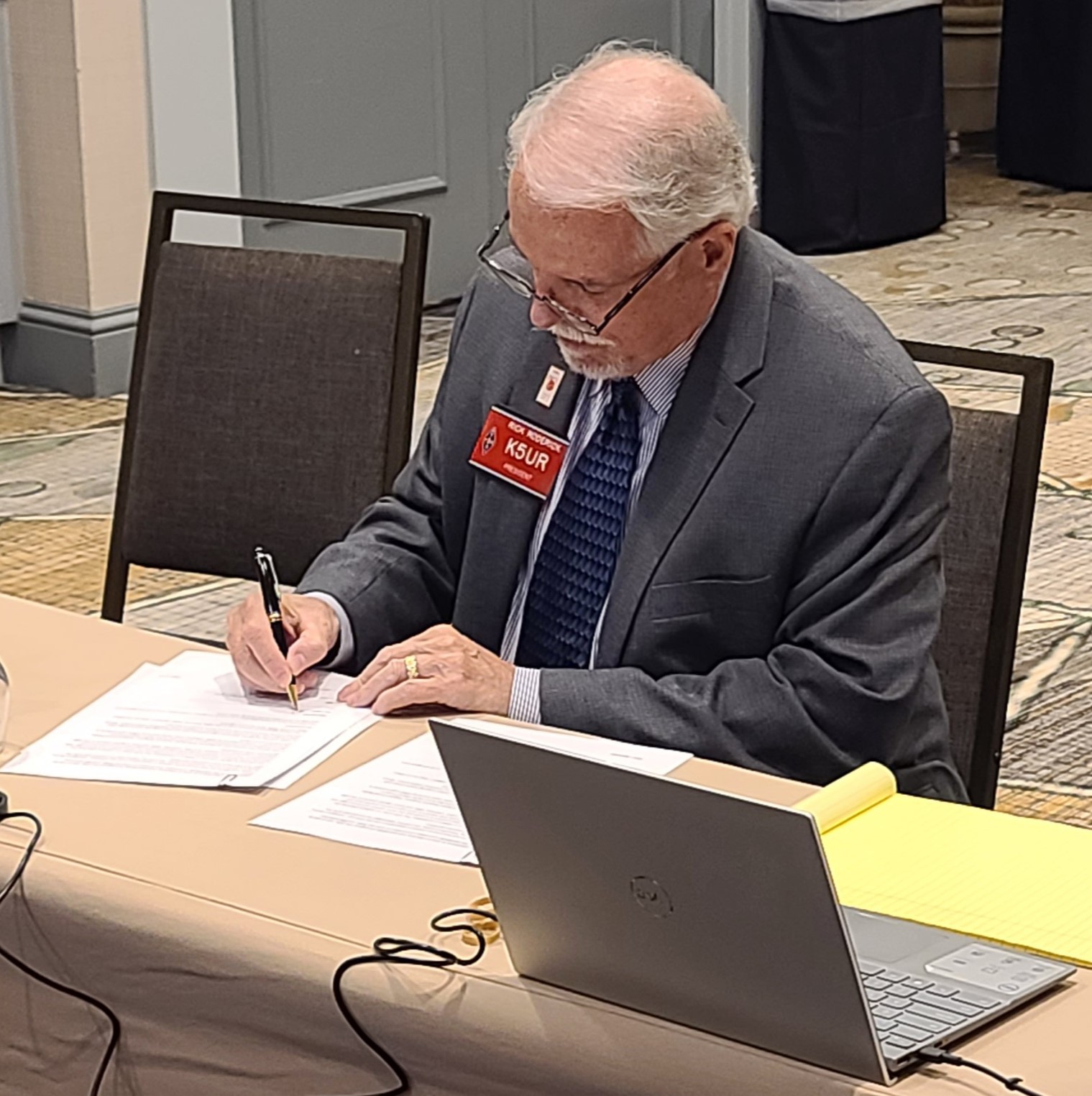 ARRL President Rick Roderick, K5UR, signs memorandum of understanding between ARRL and RRI. [Photo courtesy of Phil Temples, K9HI] | | | |